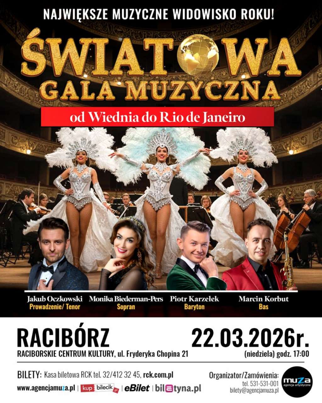 Już 22 marca o godzinie 17:00 w Raciborskim Centrum Kultury odbędzie się muzyczne widowisko zatytułowane „Światowa Gala Muzyczna – Od Wiednia do Rio de Janeiro”. To wydarzenie będzie częścią ogólnopolskiej trasy zorganizowanej przez Agencję Artystyczną MUZA, oferując publiczności unikalną muzyczną podróż przez różnorodne style i emocje.